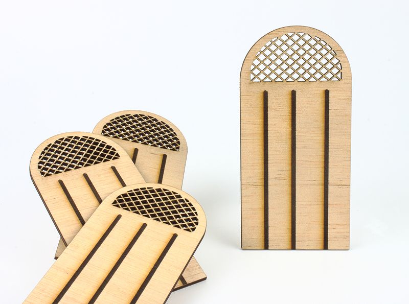 Puerta de medio punto para arco realizada en panel madera en blanco (sin envejecer), con celosía calada cortada con láser.