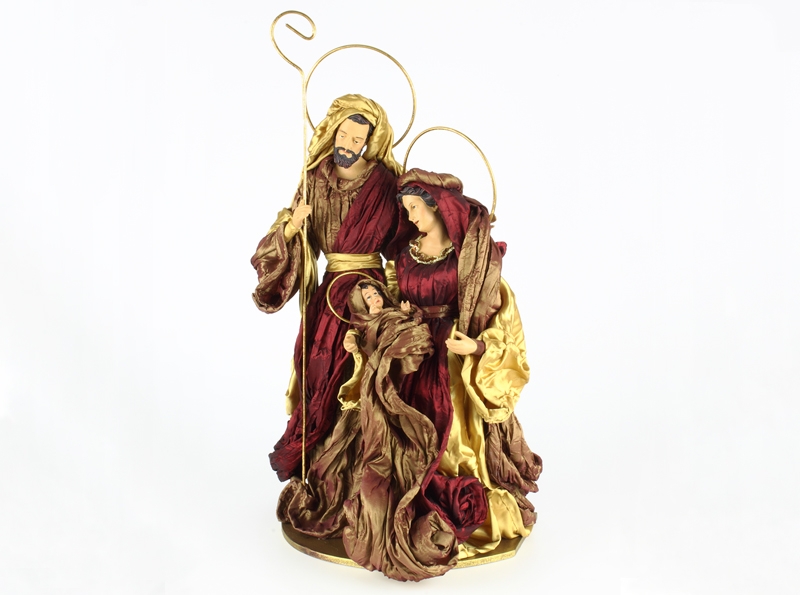 Nacimiento filipino decorado con telas drapeadas y/o encoladas en tonos rojo borgoña y dorados. Las partes visibles de la anatomía de las figuras (caras y manos) están realizadas en resina policromada. Coronas de metal latonado.