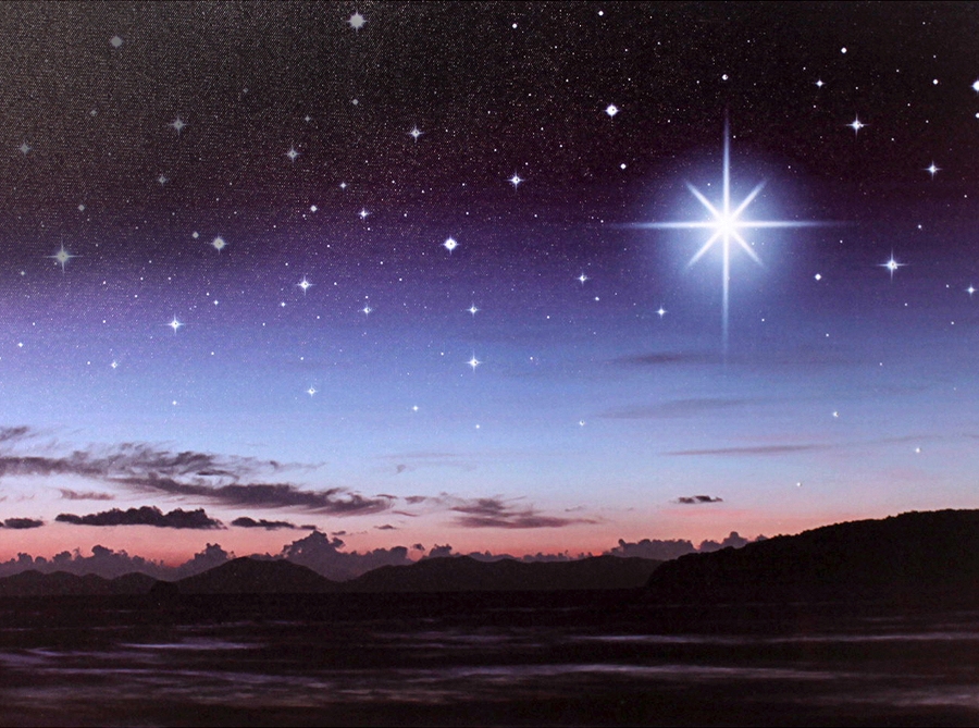 Fondo con luz para el belén, que representa unas montañas, nubes del crepúsculo, y un cielo estrellado con la estrella polar.