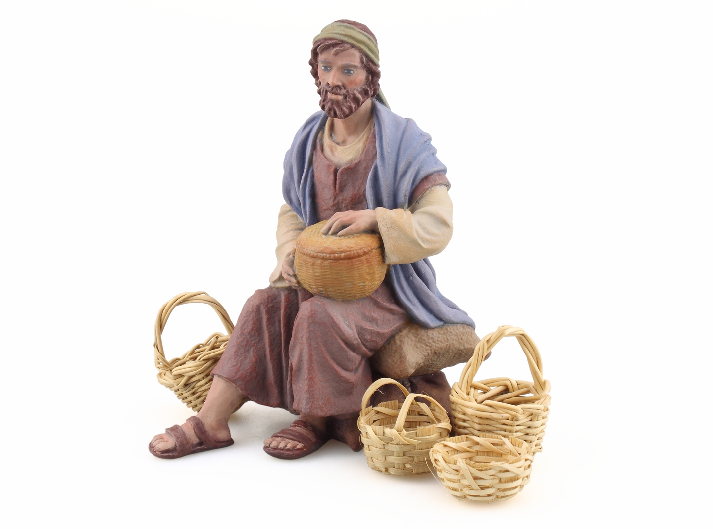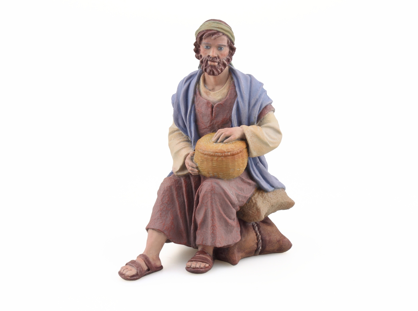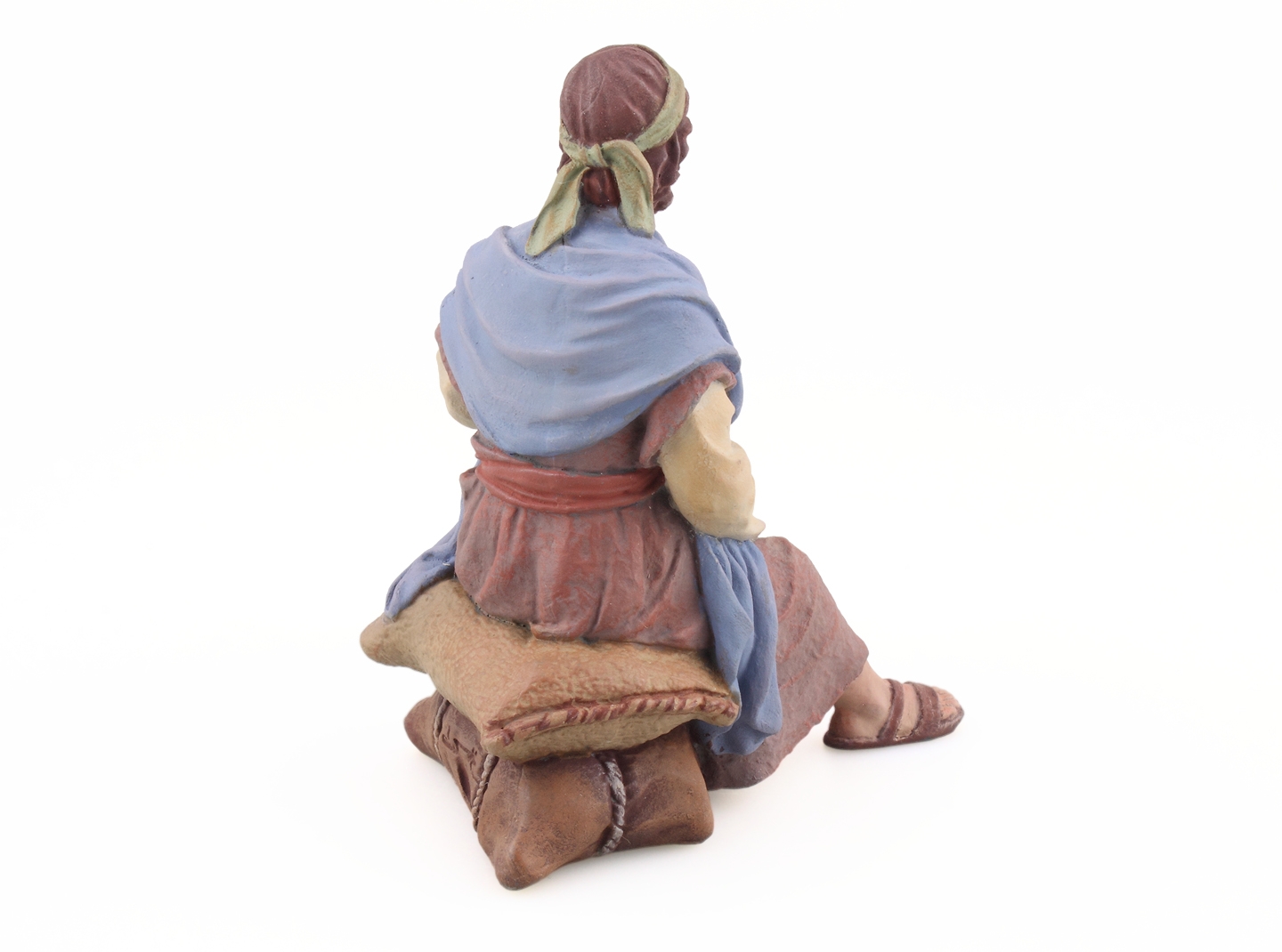 Figura de belén de estilo hebreo, que reproduce una escultura creada por Montserrat Ribes, moldeada mediante un proceso totalmente artesanal, pintada a mano en el taller de la propia escultora, y que lleva su firma grabada (se acompaña de Certificado de Autenticidad).