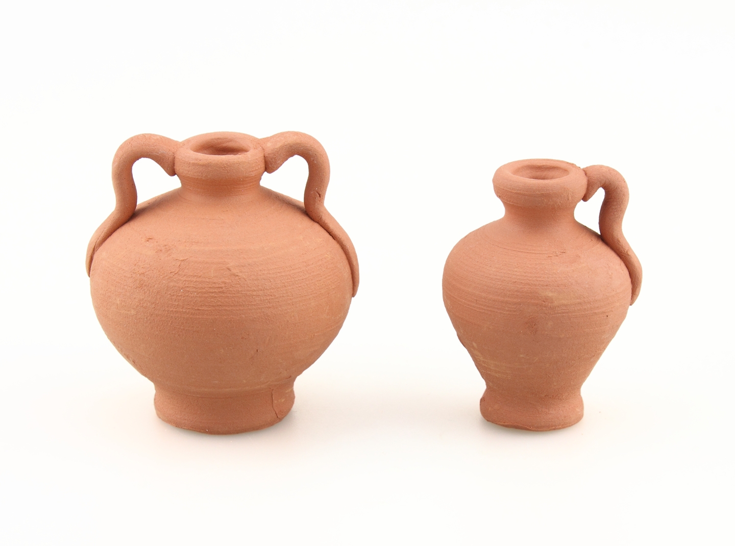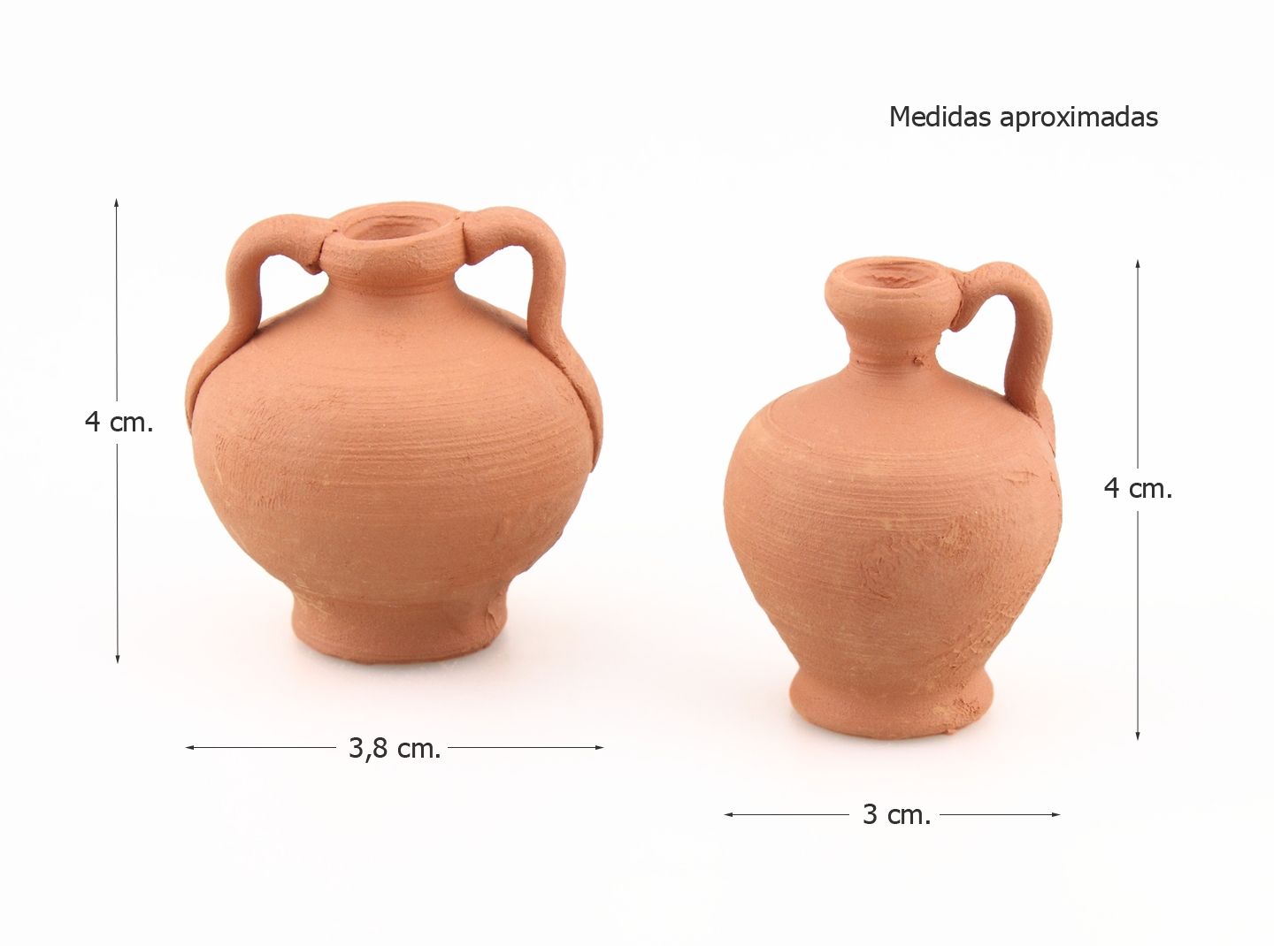 Reproducción en miniatura de unos cántaros con asas para decoración de belenes, dioramas, y casas de muñecas.