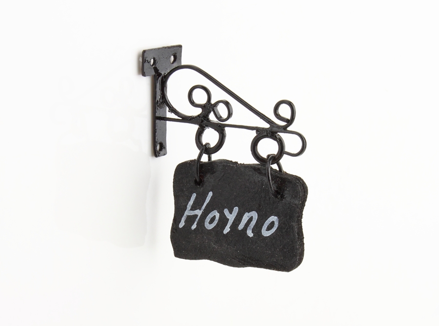 • Material: Cartel de madera MDF con soporte metálico lacado en negro. Texto pintado en ambos lados del tablero.